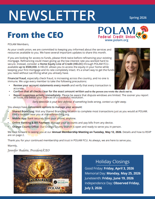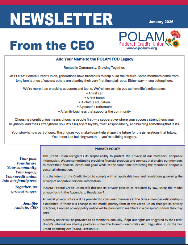 POLAM is dedicated to serving the financial needs of our members. As a not-for-profit financial institution, our goal isn’t to generate profits, but to return value to our members by offering the lowest possible loan rates and the highest dividend rates our earnings allow after covering operating expenses.
